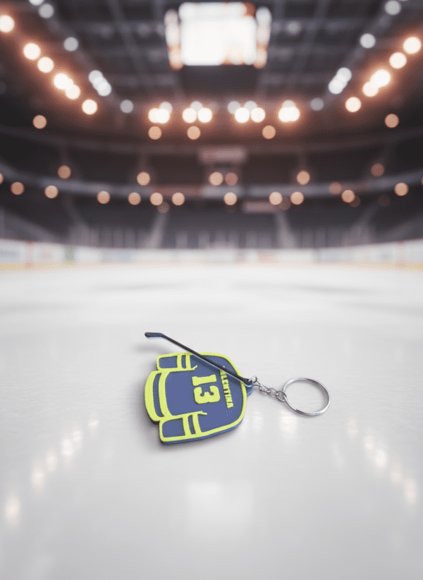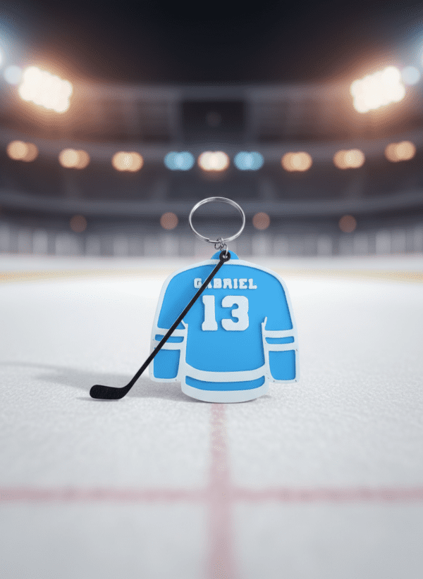 Personalized ice hockey jersey keychain with custom name and number. Perfect for team gifts, players, and hockey fans.